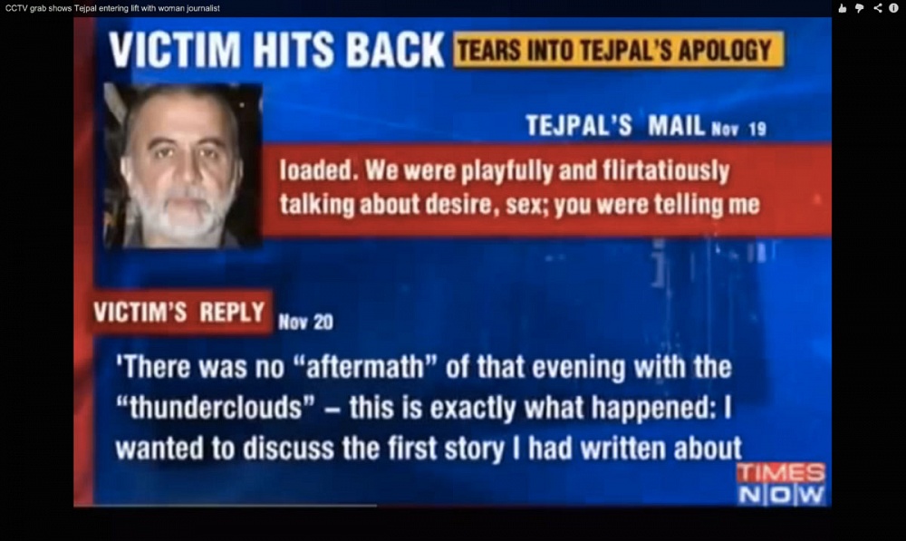 The shape of the accusation is public knowledge: the young woman was the chaperone looking after De Niro and his daughter; one evening Tejpal accompanied her and they escorted De Niro and his daughter to their hotel room. On the way down in the elevator, from the second floor to the ground floor, Tejpal allegedly made a serious attempt at initiating a sexual liaison despite the woman’s clear protests. According to the woman, Tejpal kept the lift ‘in play’ by pressing the buttons while carrying out acts that included partially disrobing the woman, digital penetration, and attempted cunnilingus. The woman escaped and made her way back to her room where she told colleagues present what had happened. She did not make any further complaints that evening. The next evening there was a repeat of the incident, apparently to a less extreme degree, when Tejpal allegedly grabbed the woman and pulled her into the same lift. Again, the young woman freed herself and escaped.