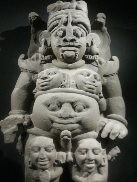 Some pieces that remain in my memory: the marble Bhairava-Shiva from eleventh-century Gujarat, an anatomically precise sculpture of an old man, dressed in transparent rags, draped in skulls and a corpse; a nineteenth-century bronze frame from Andhra Pradesh that would have stood in the center of a temple with a mirror inside—the only god you will see is the one residing in you; a sandstone of four mother-goddess figures from eighth- or ninth-century northern India; a print of Gandhi with multiple arms confronting a British officer as a death god from the 1920s. There was a lot more: three-dimensional and two-dimensional works, precisely and realistically rendered or completely abstract, a mind-boggling variety of materials for a fantastic variety of stories, images, and beliefs.
