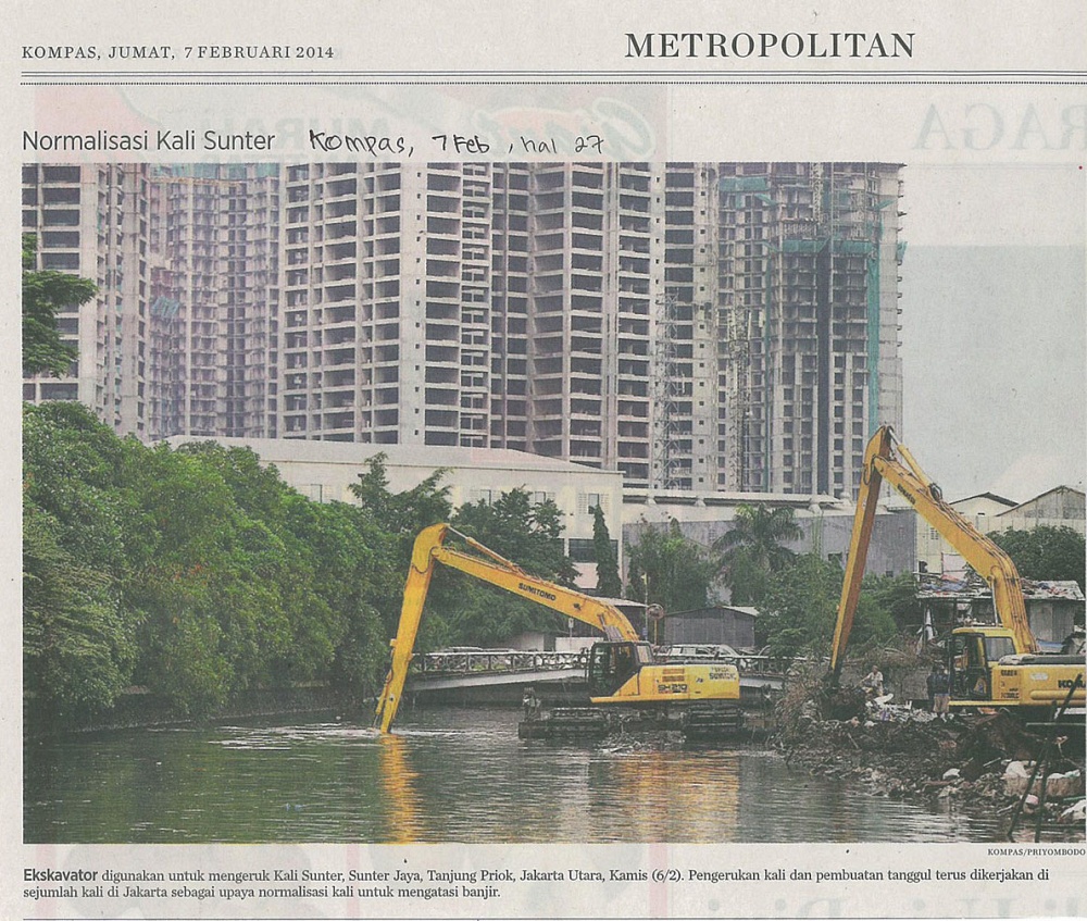 Over a year ago I was walking in Jakarta along the Ciliwung watching the machines and people remake the walls of the banks. I stopped in among a crowd who were all watching, and leaned up against a chunk of concrete, beside me a guy sat on a stool smoking. “What’s happening?” I asked. “Normalization.”