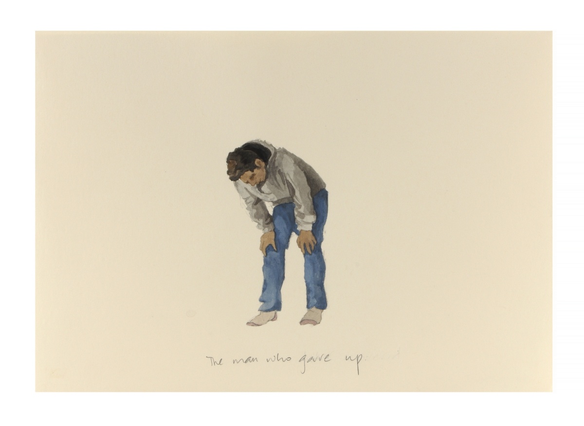 If the watercolor portraits are a semi-fictional take on the illustrations in the Guinness World Records, The most amount of people… is a kind of moving portrait of the ‘payload’, the gullible, awe-struck audiences that gather to ingest spectacles they believe to be real, unmodified events. Both the small paintings and the loops lead up to (or, away from) the large projection that covers one whole wall of the gallery space. Watching An Unforeseen Situation (2015), you are not clear at first whether you are looking at a documentary or documentation of a performance. Two or three men wander between rows and rows of plastic chairs arranged on an open lot; as the sun beats down, the men stack the chairs into small towers; after a while they cart them away. A title card informs us that the event depicted, organized by a government agency, was a failure—not enough people showed up to break the record of the most number of people singing a national anthem together. In the next sequence we see a close-up of hands packing gift items—cheap clocks in the shapes of apples—into little boxes; as the boxes move in and out of the frame, every now and then the hands insert a round stone instead of a clock. A title card informs us that the anthem-singing-record-breaking attempt failed because the gift boxes used to lure people to the event contained the occasional dud. In another video we see a man doing push-ups in a run-down apartment. The cut moves to a shot of a TV broadcast covering an event where a man smashes a number of walnuts in a certain amount of time with his forehead. We are told his record was nullified because the jury was found to be suspect. The man in the room lines up walnuts on a table. He is planning to take on the walnut-smashing record. The man now gently bangs his forehead against a wall: he is training.