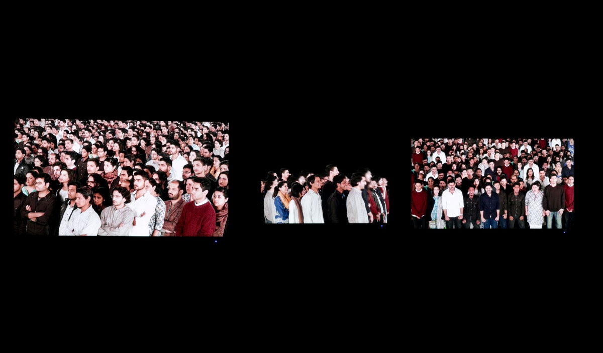 Abidi has a concurrent show at Experimenter Gallery, “The Man who clapped for 97 Hours” (January 15–February 27, 2016). It continues the artist’s exploration of the peculiar cat’s cradle of popular culture, politics, and the media that we find in South Asia and more specifically in Abidi’s home country, Pakistan. In this show, Abidi departs from the South Asian obsession with challenging or creating new entries for the Guinness World Records. There are watercolor portraits: small studies of imaginary figures, all male, attempting to break fictional world records for clapping, yawning, splitting hair, walking in circles, or even hiding your world-record mustache so it does not get shaved off. In The most amount of people standing still, screaming, laughing… (2016), three hanging screens show loops of a crowd going through different reactions as they look on at something outside the frame. After a while, you see that the crowd is made up of composite videos, using the same actors again and again, sometimes in different magnification, sometimes in different clothes. Looking at these is tangentially reminiscent of Bill Viola’s slow-motion videos of crowds, but they carry a far stronger reference to the many retouched photos that were circulated by Hindu right-wing groups during the last Indian general elections, images purporting to show mass attendance at Narendra Modi’s election rallies, and which people exposed on social media as having used repeated photoshopped clumps of the same groups to bulk up the crowd.