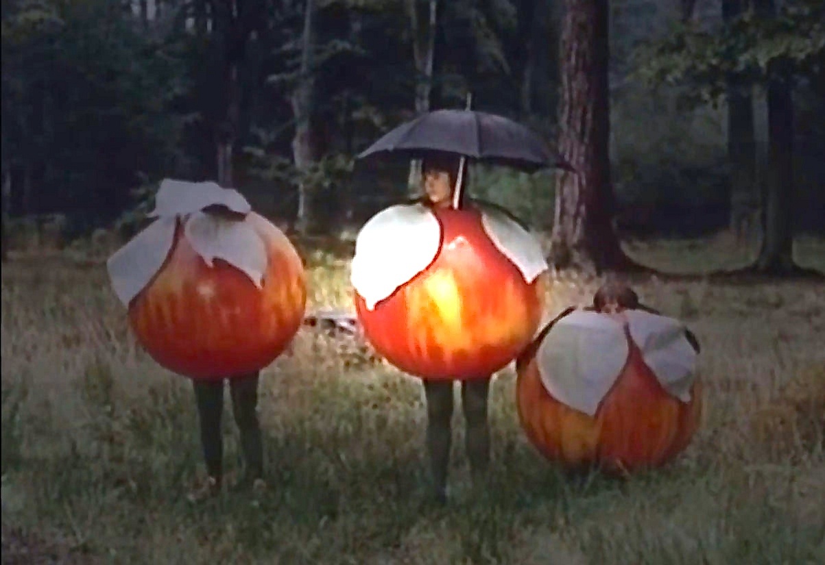 If the medium is the message, then the image above is doing double duty: television and apples are the media at hand, and both are cast as vehicles of power catering to the interests of an invisible ruling class. Two decades before, authority in England had been manifest, physical—it was royal figureheads, properly accented radio announcements, and public service posters tacked throughout London. By 1967, however, Foucauldian prophecies about decentralized control were coming true, and nowhere was this more apparent than in the media. Television became the preferred means of manipulating the masses, and in the U.S., contemporary advertising came of age by co-opting the tropes of the 1960s, chipping away at the détente between mass culture and counterculture until “revolution” became synonymous with selling sneakers. Watkins’s commercial scene satirizes this brave new world by exposing television for what it was, and he underscored the point by putting his actors in apple costumes. It’s a good joke, and also a classic one. We all know that an apple a day keeps the doctor away, but an apple is a bivalent symbol, a natural Trojan horse. Apples are healthy and tainted, delicious and inedible. It’s always possible something more sinister lies beneath its waxy exterior.