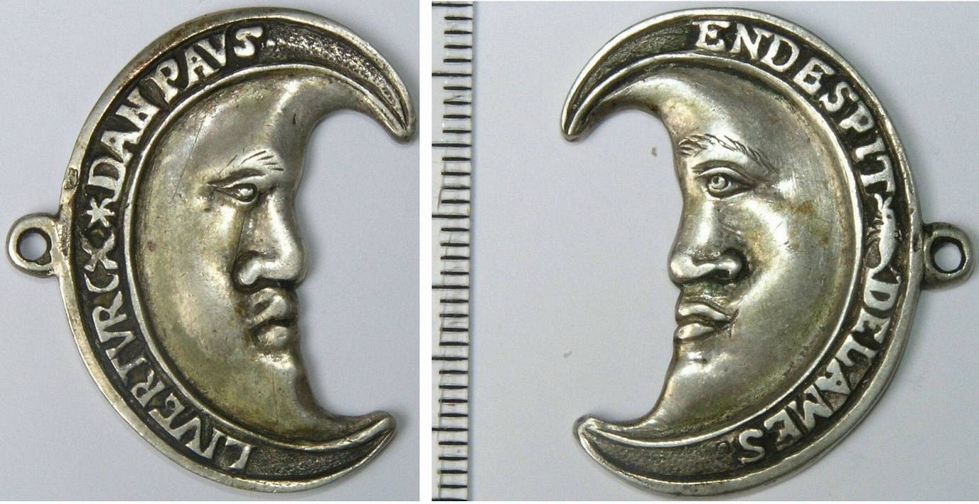 Museologically this catalog illustration is titled Better the Turks than the Pope!, and is described as a “Protestant badge in the shape of a half-moon,” dating from 1574. So-called Sea Beggars, who set out from Rotterdam in a fleet of lowly craft to relieve the siege of Leiden—having first deliberately flooded the reclaimed farmland in between—wore the badge pictured.