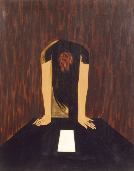 I am wont to treat that page as a projection screen but first need to deal with the hunched mediator who completes this triangle of emotional expectation between myself and the letter. I, the viewer, stand on the opposite end of the table. There is hardly any communication between the body in the painting and my own: I want to connect while the other one refuses. From here on, I am left alone with my drive for emotional narrative, for pity, with my urge to fill in the blanks, with my need to feel good and involved. Conjecture, if not metaphor, is the primary tool at hand.