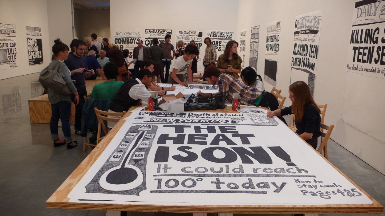 A few years before, Aleksandra Mir had made a similar gesture for exhibition at Mary Boone Gallery with her work Newsroom 1986–2000 (2007). During its two-month run, the artist and several assistants inhabited the gallery, creating oversized drawings of the New York Post and New York Daily News from that fifteen-year period. “Every day,” Mir wrote, “there will be new art and old news on the walls.”