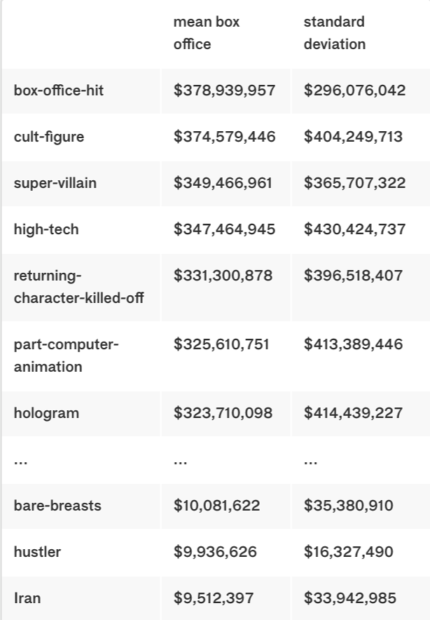 The framework we built is filled with assumptions. The biggest is also the most basic: we presume that there is a relationship between ticket sales and the characteristics of a film. Our theory was that individual components, taken alone and together, make an impact on the earning potential of a movie. Certain aspects of this premise are most certainly true. Genre is a strong indicator of total take. Adventure and animation absolutely dominate ($127,772,892 and $125,248,753 mean box-office takes, respectively), and fantasy and sci-fi are not far behind. Good news for our film. Comparatively, romance ($32,953,850) and comedy ($38,440,514) are not all that powerful as blockbuster genres. Keywords tell a similar story. If you are given a choice between bare breasts and a hologram… choose the hologram: