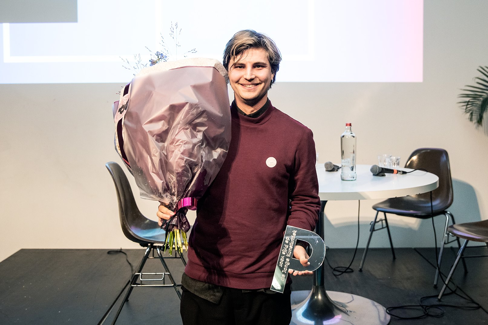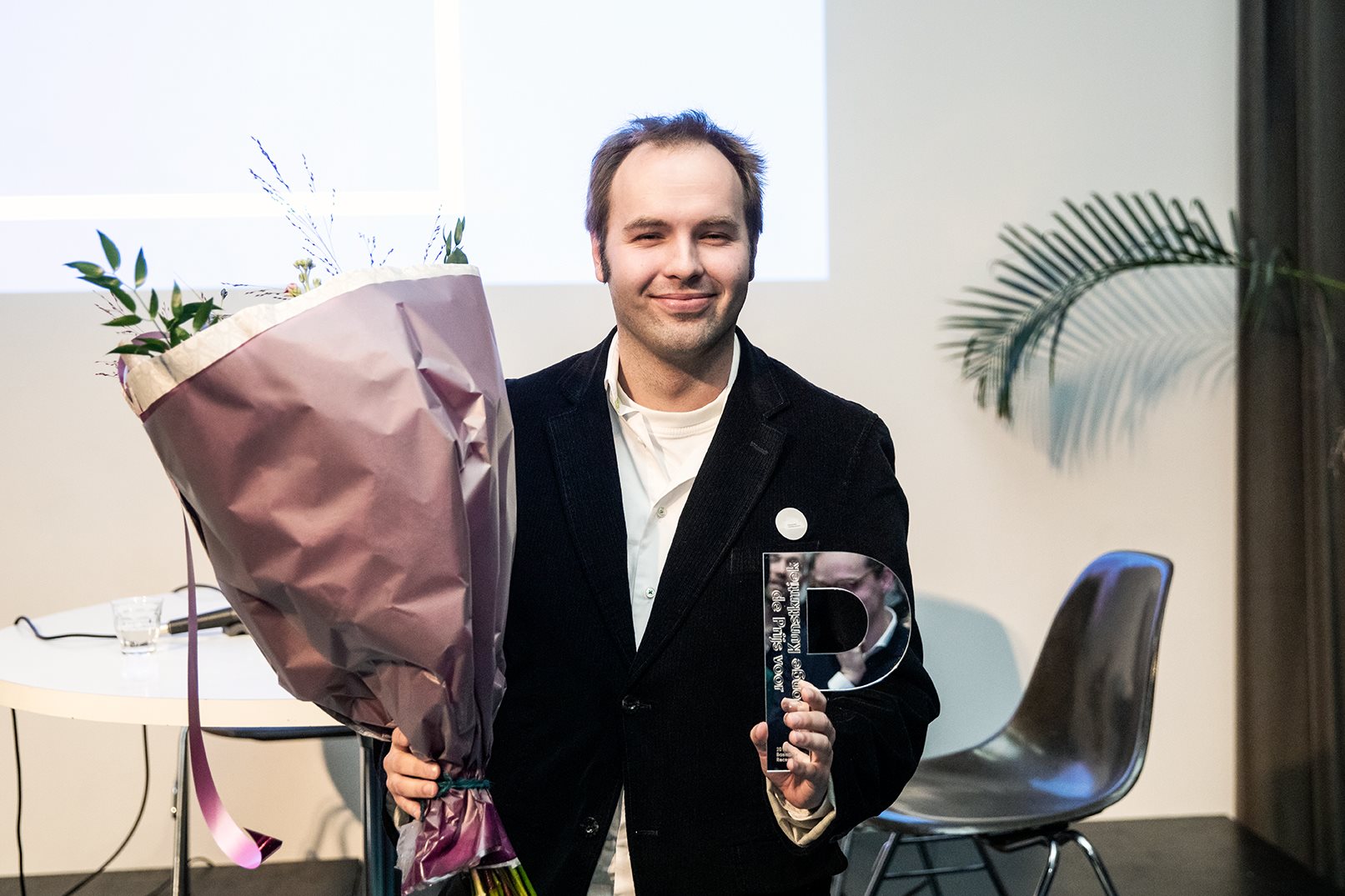 Boris Van den Eynden, hoofdprijswinnaar de Prijs voor Innovatieve Kunstkritische Praktijken. Foto door Aad Hoogendoorn.