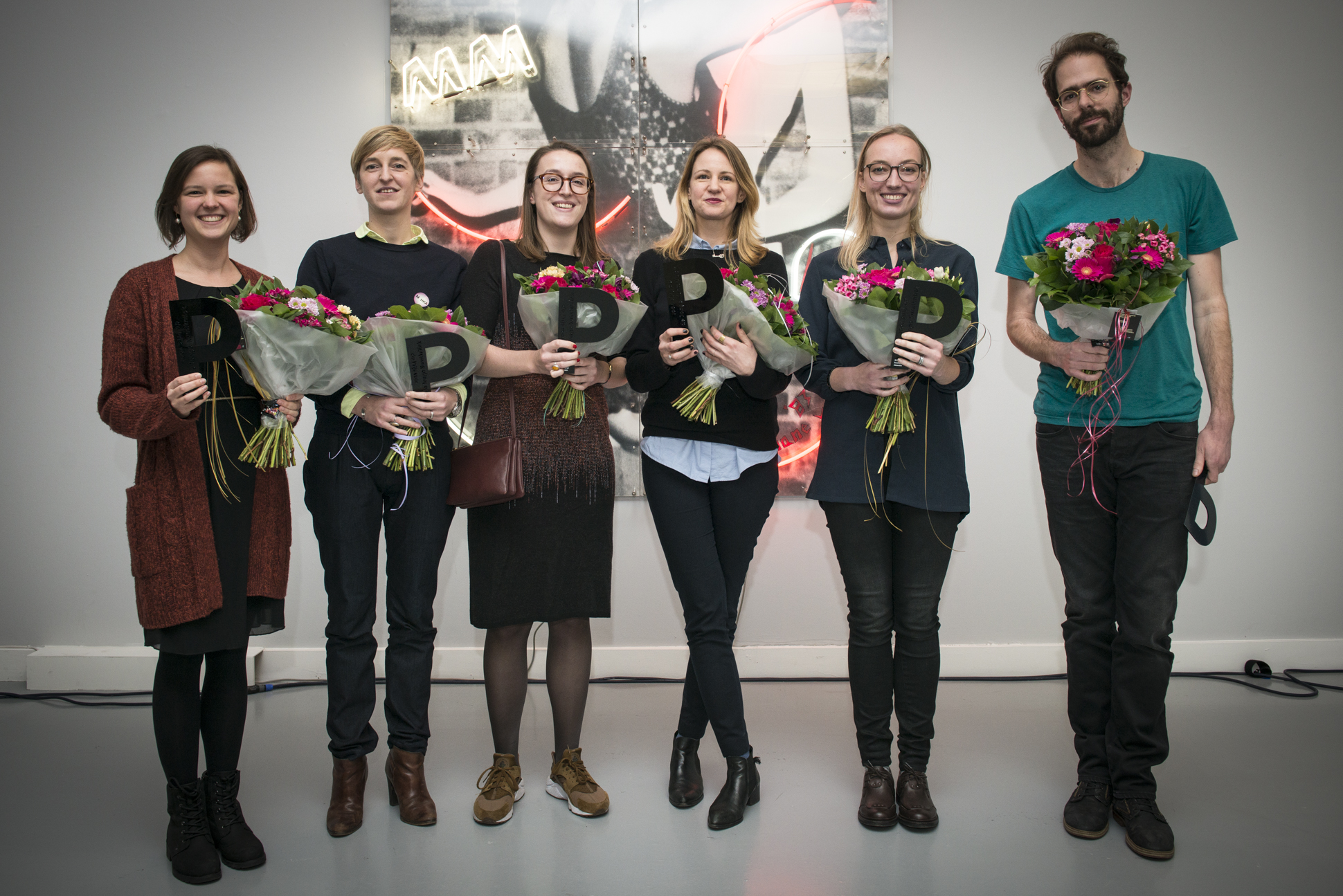 Foto: Genomineerden de Prijs voor de Jonge Kunstkritiek 2016. V.l.n.r. Sophia Zürcher, Nele Wynants, Julia Mullié, Laurie Cluitmans, Brenda Tempelaar, Sébastien Hendrickx. Foto door Bram Goots