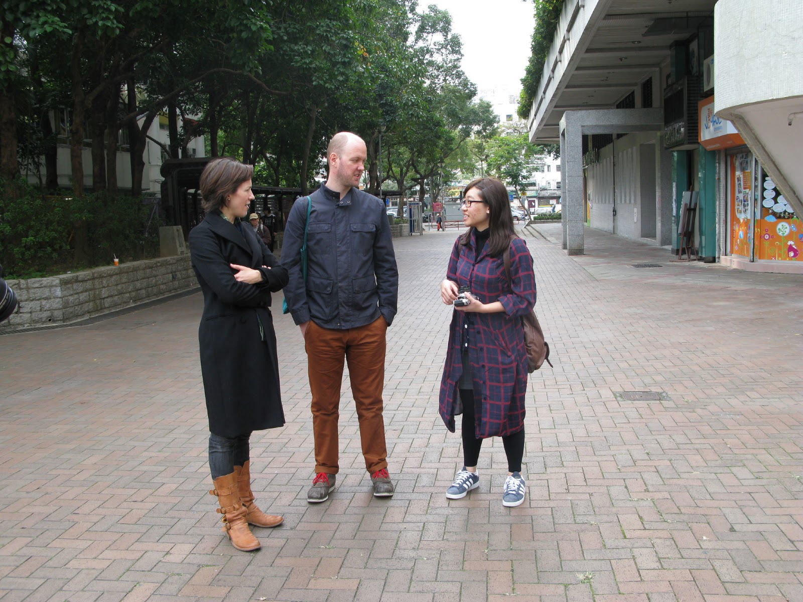Tai Po chatting. Artist Ho Sin Tung with Mimi Brown of Spring and Max Andrews of Latitudes.