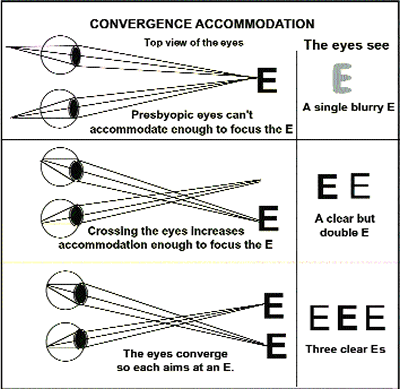 Figure 1. Showing convergence accommodation – a way to stimulate accommodation (focusing power) for presbyopic eyes to see near objects. The word presbyopia comes from the Greek word presbys(πρέσβυς), meaning “old man” or “elder”, and the ancient greek word ops (ὤψ), meaning “eye”.