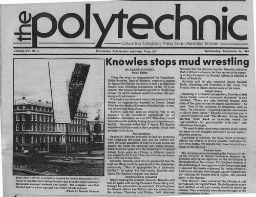 A variation of George Rickey’s Two Turning Vertical Rectangles stood in the campus of Rensselaer Polytechnic Institute (RPI), Troy, NY between 1972 and 1984. The work’s removal is rumoured to be related to the unsucessful financial negoitations between Rickey and the Institute to acquire it. Nicknamed The Chrinitoid, Two Rectangles, Vertical Gyratory Up, Variation III was returned to Rickey’s studio.